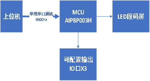 基于AiP8P003H芯片開發(fā)的LED屏驅(qū)動(dòng)方案,可以通過單線通訊,驅(qū)動(dòng)最多42段的LED段碼屏,并提供3個(gè)可編程的coms輸出端口。通訊協(xié)議可定制(如串口通訊,比例碼通訊)。